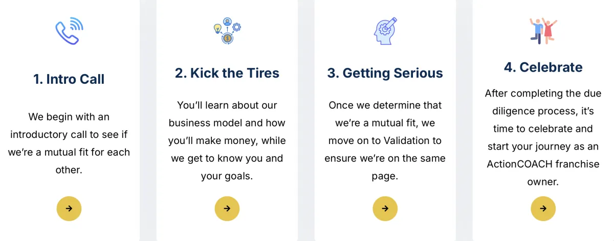 We don't sell franchises; we award them to the right people. If you're the right fit, the opportunities and lifestyle you can create with our business model and access to our propreitary business-building methodioliges are literally endless. And owning an ActionCOACh franchise will be the best and most rewarding business and career decision you will ever make. We have a simple, but proven due diligence process to see if we should move forward or not. Here's a simple overview of it: .